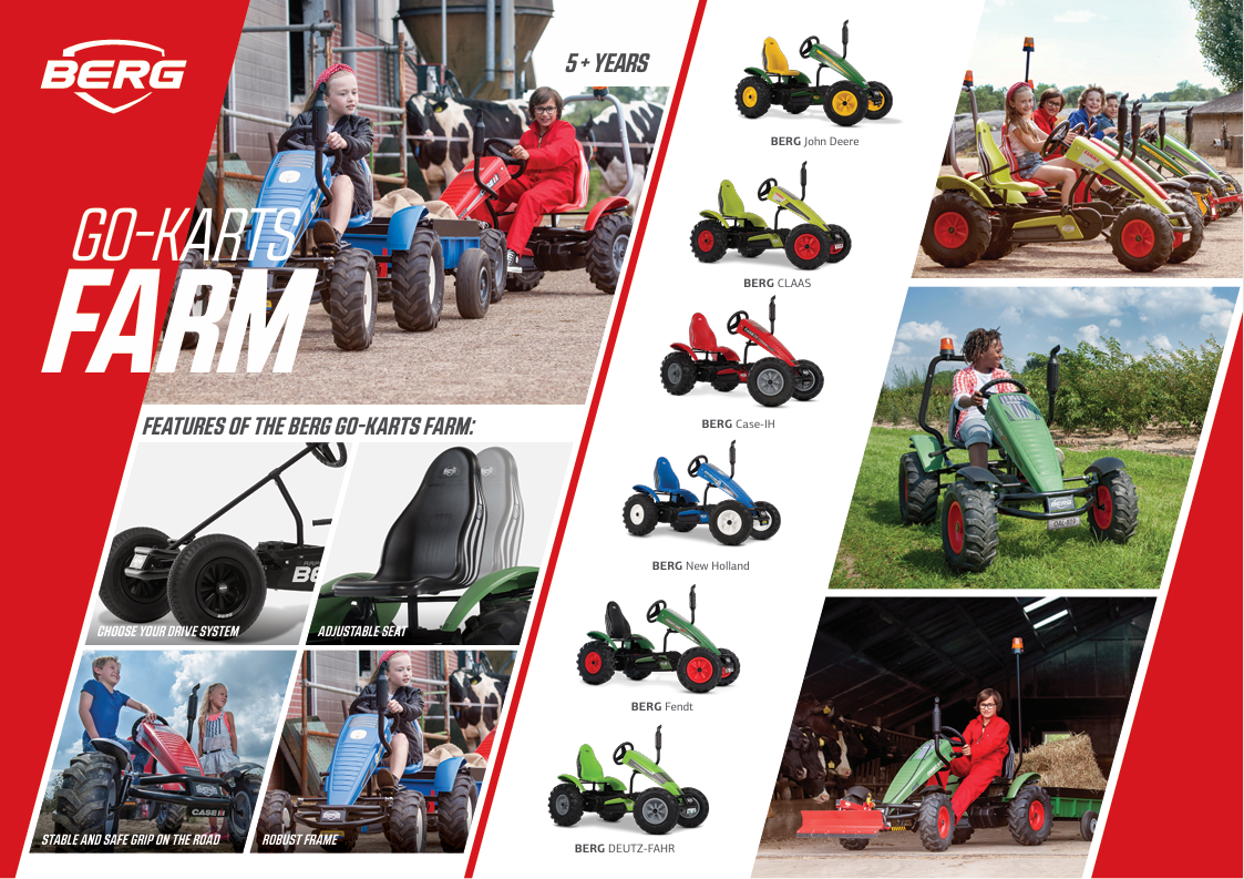 Designed for kids aged 5 and up, the BERG Farm range combines rugged durability with playful farm-themed designs. Built on a strong steel frame, these go-karts handle grass, dirt, and pavement with ease thanks to their durable tyres that offer excellent grip and stability. Bright colors and authentic farm styling make every ride an imaginative outdoor adventure